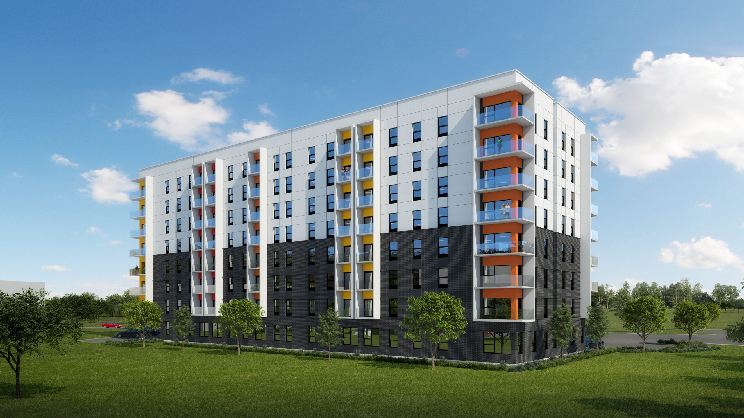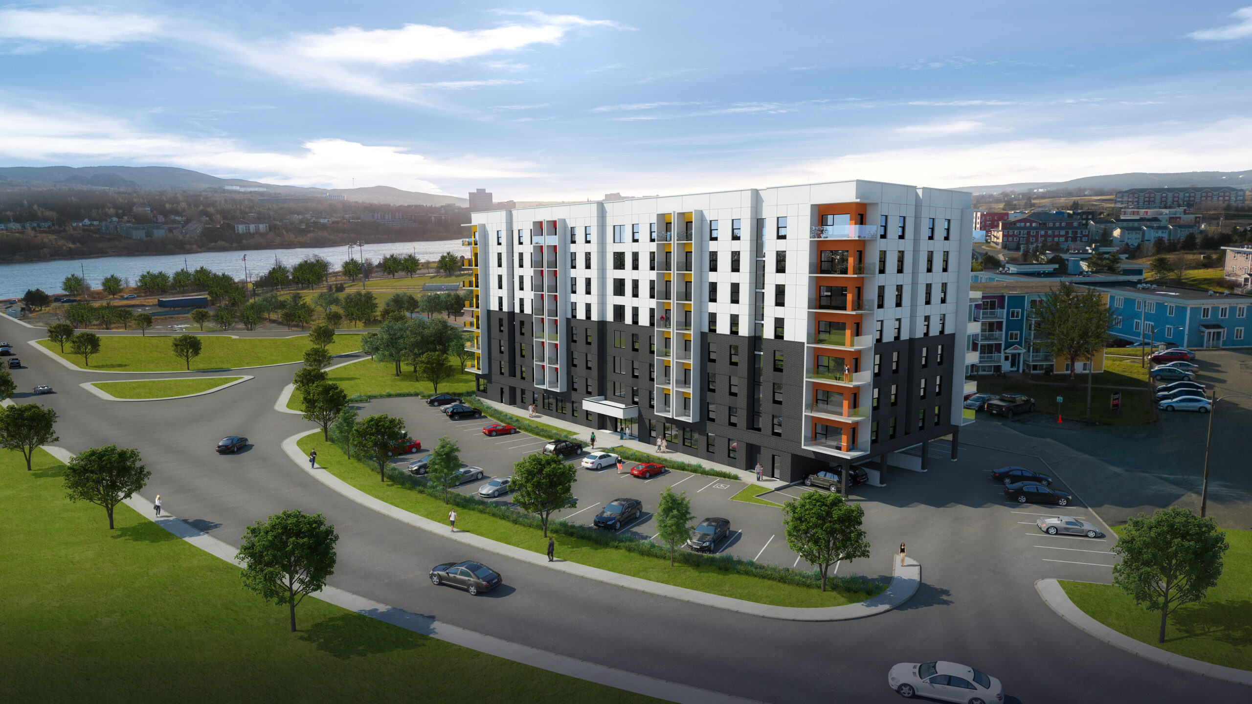 The proposed eight-storey 101-unit senior’s apartment building was designed to replace an existing vacant and delapitated building in the Pleasantville neighbourhood of St. John’s.The building was envisioned as one linear form with small reliefs/recesses along the front façade to break up the linear mass of the building. Several exterior material options were combined to bring visual interest to the overall linear form of the building. The objective was to use a material pallette that would fit within the character and look of the existing neighbourhood, but at the same time present a contemporary aesthetic to the building. To break up the mass of the brick, strips of light grey composite metal panel was used in between the punched windows to “lighten” up the overall mass of the building on the site. The punched windows and entrances are black anodized aluminum systems with double glazed glass units, which closely complement the brick facade. The height of the entrance canopy and overhangs was set at a human scale to create a more residential feel for the residents.